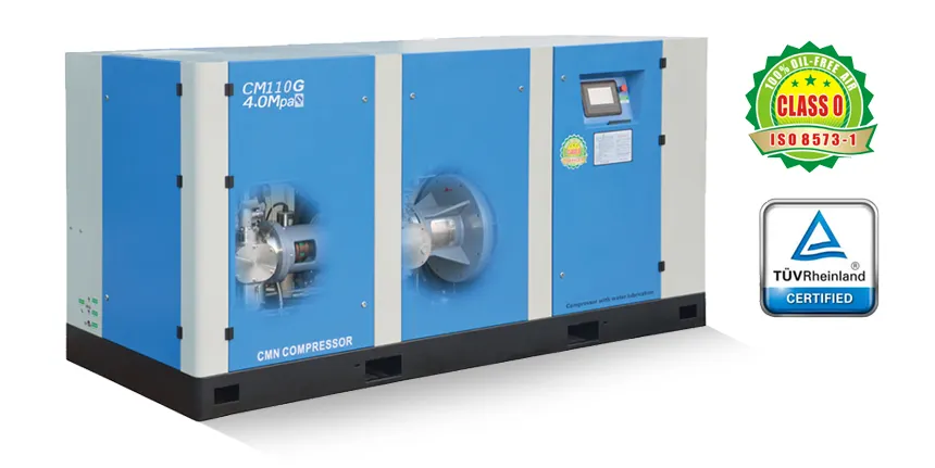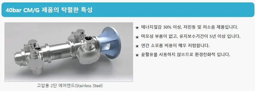 사각모양 완전밀폐형 설계되었고, 주축이 1회전할 때 12번 압축하는데, 이것은 12개의 실린더를 가진 엔진과 동등합니다. 에어엔드는 무진동, 저소음(78dB) 이지만, 특수 설계시 70dB 까지 낯출 수 있습니다. 기존의 기기와 비교할 경우, CMN 제품의 점유면적은 1/2, 중량은 1/3에 지나지 않습니다.