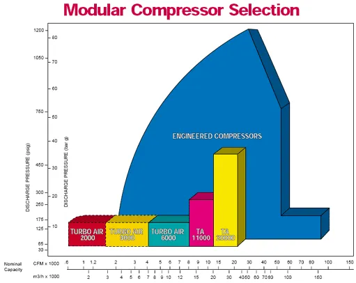 The TA20000 is designed to be a four stage air compressor which is also capable of combined service with booster applications with a total of up to six stages. The flow for main air is 16,000 ICFM (20,000IM³HR) to 23,000 ICFM (34,1500IM³HR) in a four stage configuration with a discharge pressure of up to 375 psig. Booster Pressure can go as high as 1100 psig with mass flow up to 50% of the Main Air flow.