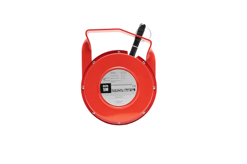 DSPA 5M은 손잡이가 달린 원형 금속 포드로 구성되어 있습니다. 이 휴대용 소화기는 핀을 당기면 작동하며 화재가 발생한 모든 방에 버릴 수 있습니다.