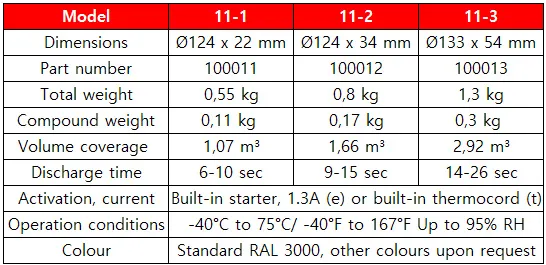 DSPA 에어로졸 발전기 11-1, 11-2, 11-3은 매우 효과적인 소화 시스템의 일부로 사용할 수 있습니다. DSPA 발전기는 비압화 방식으로 보호가 필요한 실내나 구획 내부에 설치됩니다. 활성화 후 에어로졸 구름이 생성되며, 이 구름은 부피적으로 팽창하여 공간을 침수시키고 화재를 진압합니다. DSPA 발전기는 주로 일반적으로 비어 있는 공간과 비어 있는 공간에서 사용하도록 설계되었으며 클래스 A, B, C 및 F 화재에 효과적입니다.