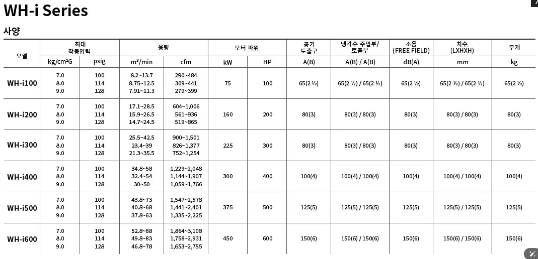 WH 시리즈는 터보윈의 표준 모델이고 WH-i 시리즈는 IoT 기능이 접목된 스마트 터보 컴프레서 모델입니다. 터보윈의 특허인 냉각 토출 소음기인 쿨링 제트는 WH-i의 소음수준을 (3~5dB)까지 낮추는 장점을 제공합니다.