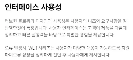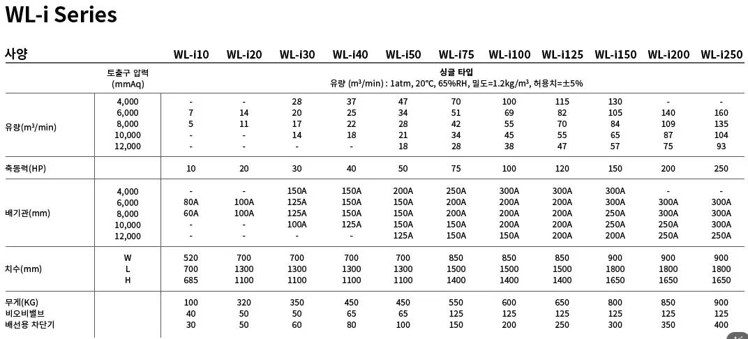 WL 시리즈는 터보윈의 표준 모델이고 WL-i 시리즈는 IoT 기능이 접목된 스마트 터보블로워 입니다. 제품 보증 기간은 보통 2년이지만 WL-i 제품은 5년을 제공하고 있습니다
